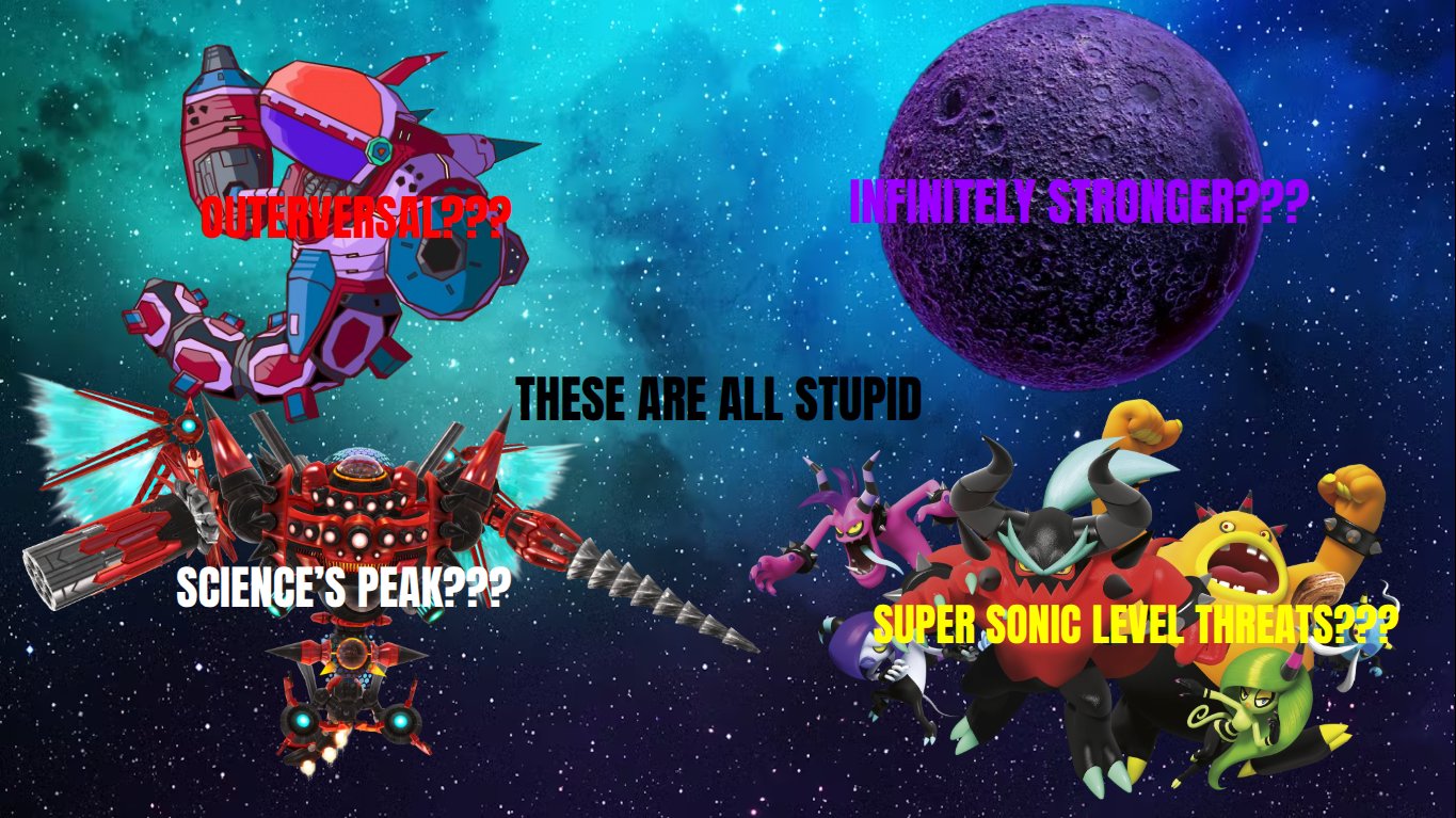 Shadow, on the other hand, thrives on raw, calculable scaling. Even without Archie Comics, Sonic Prime and Sonic ‘06 establish him as capable of surviving and combating entities who exist beyond ordinary universal constructs. Solaris’ destruction and recreation of time — a 5D–7D multiversal continuum — directly scales to Super Shadow. Meanwhile, his friends encounters with Void, Maginaryworld, and Erazor Djinn push the boundaries of his base form to multiversal or beyond levels as well, uni+ at a minimum. Even if we were less generous with both, Sonics cast consistently face universal threats, something fairly rare in Pokemon that can cap at Multi-Galaxy to Universal with help.