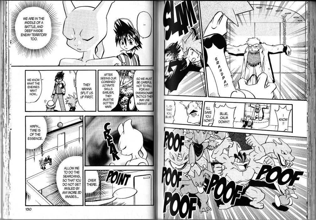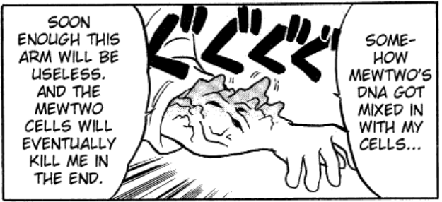 Mewtwo’s path in Pokémon Adventures diverges but echoes the same themes. Mewtwo was born unstable, and so in order to stabilize its life, its creators fused Mewtwo’s DNA with the scientist Blaine, which led to Mewtwo feeling alien in the world, both to Pokémon and humans. Due to being born in the shadows of Blaine’s experiments, Mewtwo initially rejects human contact, living in seclusion. Yet over time, it forms an uneasy alliance with Red and other protagonists when greater threats — such as the Elite Four’s destruction of Kanto — force it to fight alongside them. Though it never fully trusts humans, Mewtwo shows a protective streak toward those who prove themselves worthy. This gradual shift from isolation to reluctant cooperation mirrors its portrayal in later anime arcs, such as Mewtwo Returns, where it defends its fellow clones from Giovanni’s pursuit while reaffirming its independence.